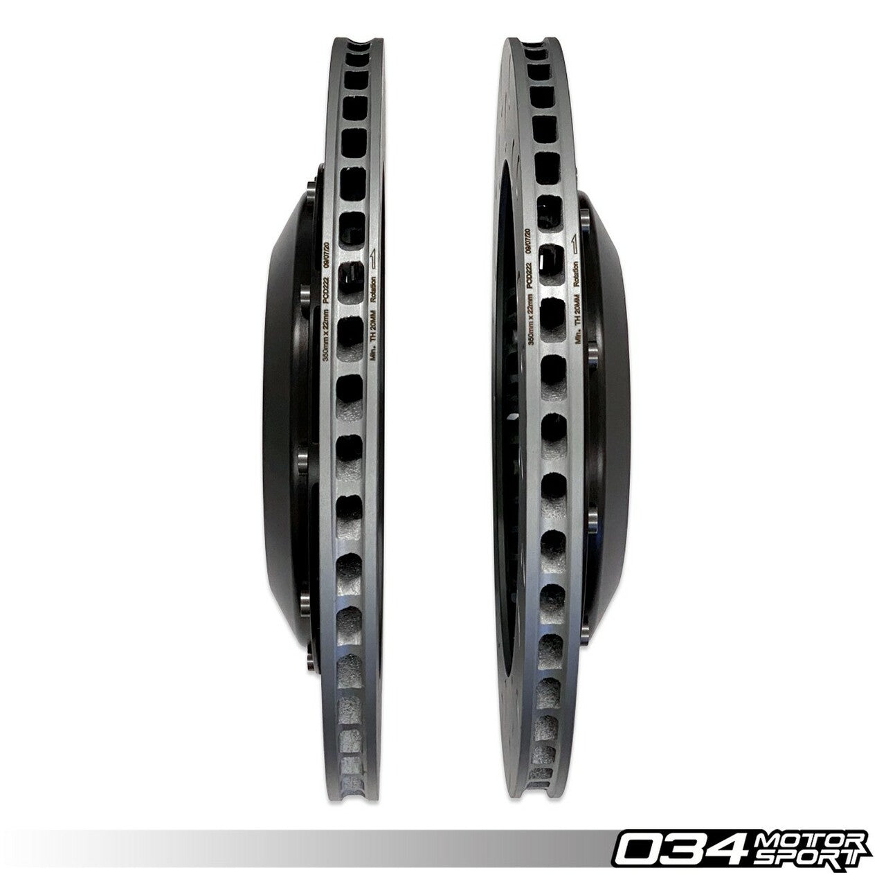 The central hat portion of the 034Motorsport rotor is made of 6061-T6 aircraft specification aluminum. The disc is constructed out of a proprietary metal alloy that can withstand immense braking temperatures while holding form. The rotor utilizes 72 directionally curved veins to forcefully flow cool air through the rotor to dissipate heat.