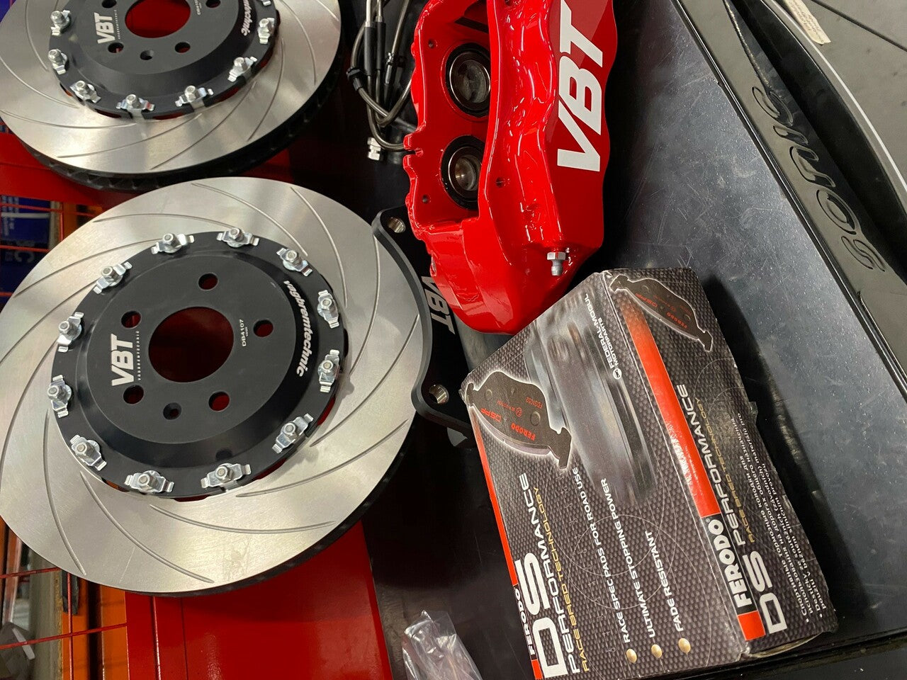 The caliper carriers are made from lightweight aluminium. These have steel thread inserts for strength along with a black anodised finish. The supplied front brake lines have been made to our specifications by HEL Performance, which include stainless steel fittings and are finished in their carbon black sheathing. The 2 piece brake discs are assembled with outer rotors made by AP Racing which are of the highest quality steel and come in either a grooved or drilled. Matched with our lightweight aluminium bells finished anodised in black, this brake disc setup is a floating 2 piece assembly and the float is in the disc bell rather than the disc. Lastly the fitting kit includes bolts that are high tensile M12x1.25 coupled with quality spring washers.