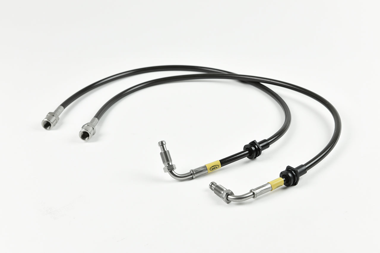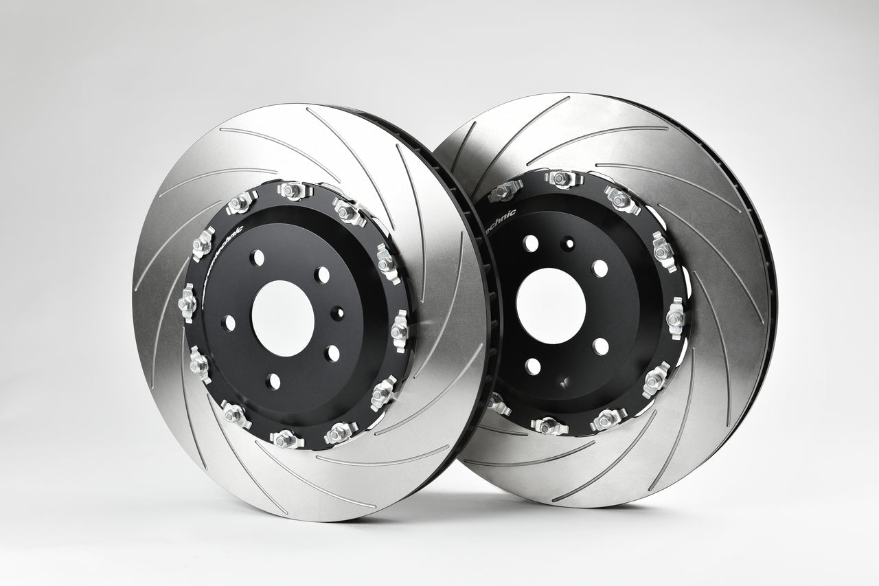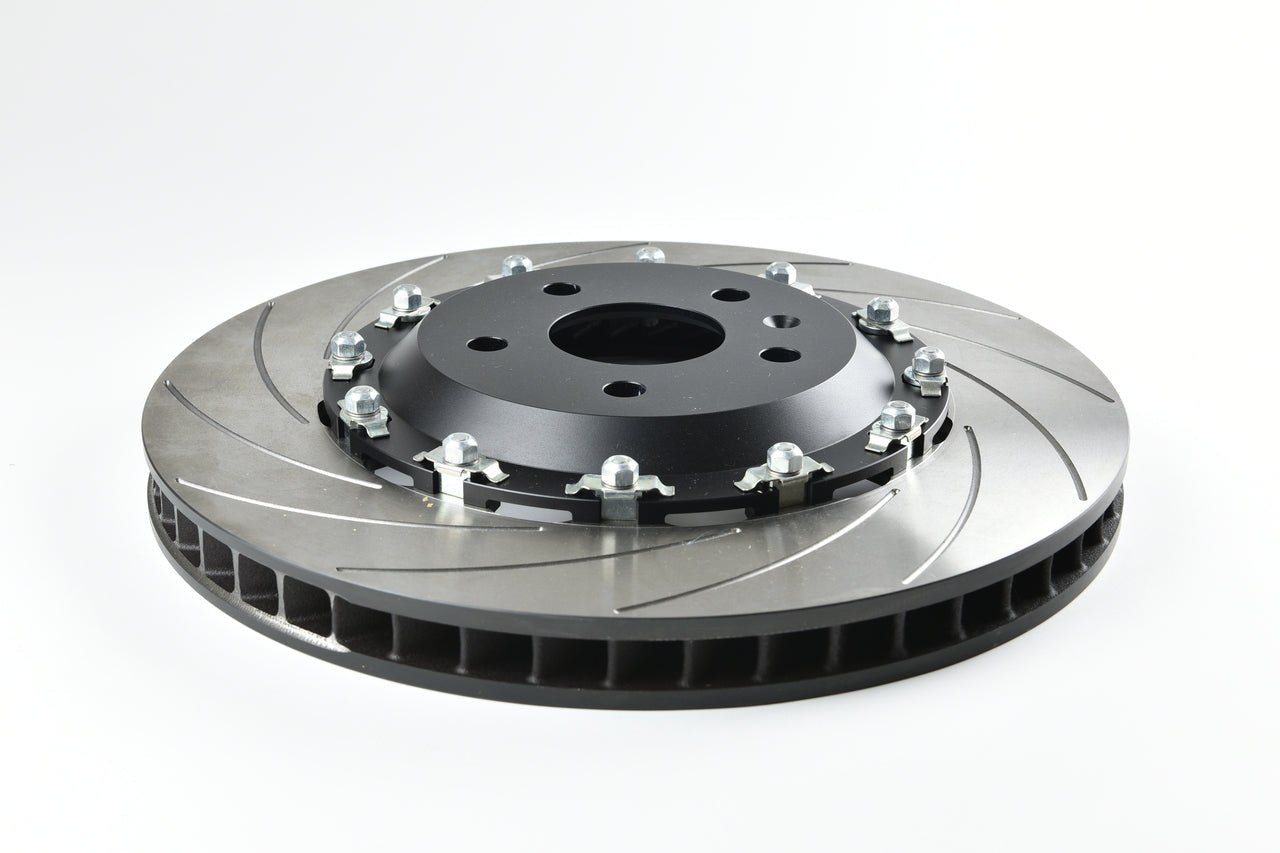 The caliper carriers are made from lightweight aluminium. These have steel thread inserts for strength along with a black anodised finish. The supplied front brake lines have been made to our specifications by HEL Performance, which include stainless steel fittings and are finished in their carbon black sheathing. The 2 piece brake discs are assembled with outer rotors made by AP Racing which are of the highest quality steel and come in either a grooved or drilled. Matched with our lightweight aluminium bells finished anodised in black, this brake disc setup is a floating 2 piece assembly and the float is in the disc bell rather than the disc. Lastly the fitting kit includes bolts that are high tensile M12x1.25 coupled with quality spring washers.